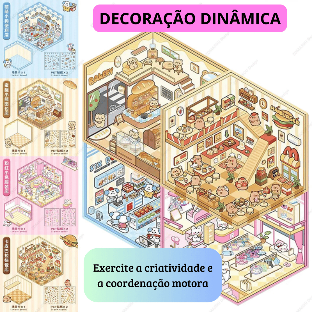 ✅Cenários temáticos (biblioteca, café de gatos, dia ensolarado e padaria) impressos em papel cartão (13×13 cm) para montar e personalizar.