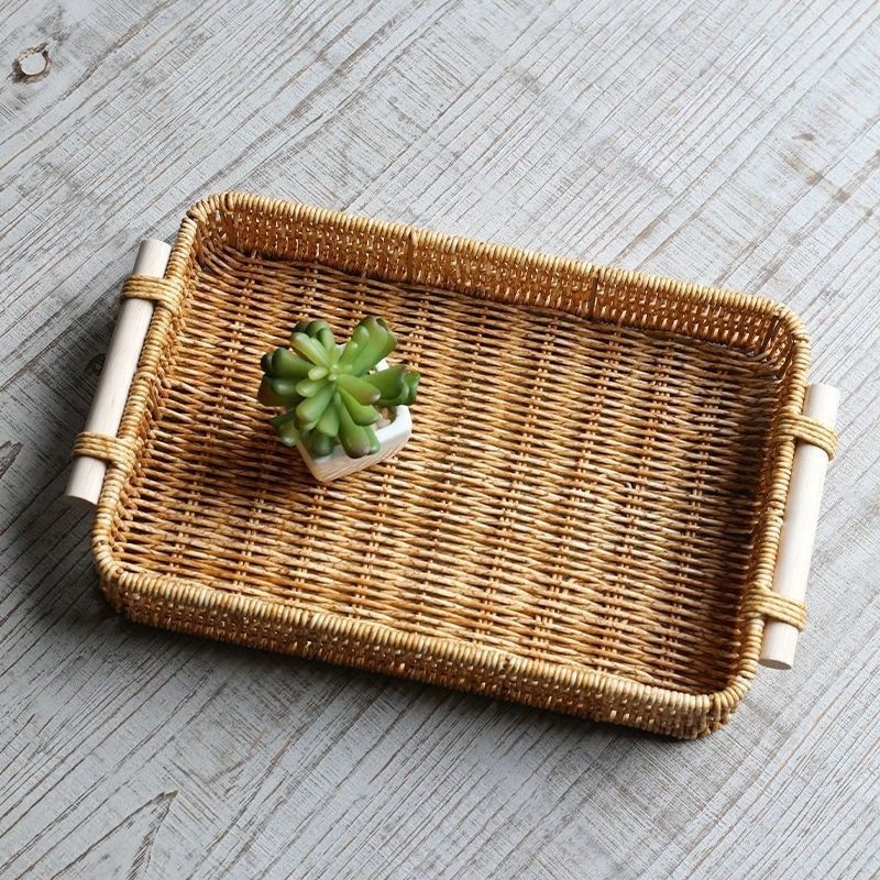 Bandeja de rattan de imitação Sala de estar Bandeja de chá Restaurante Bandeja de pão Cesta de armazenamento, tecido à mão, material semelhante ao rattan, cesto multiuso, tecnologia tecida à mão, mostrando a beleza da natureza, a sensação geral é suave, sem farpas não arranham as roupas , design de alça de madeira, aderência confortável, a alça é calma e elegante, suportada pela armação de metal da borda, não é fácil de deformar, durável, firme e bonita.
