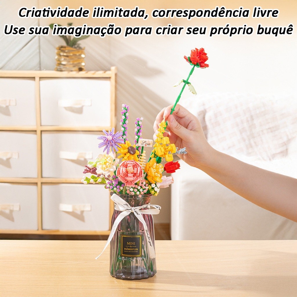 Descubra a beleza e a criatividade com nosso buquê de flores construídas em blocos de montar estilo perfeito para crianças a partir de 3 anos e também como uma charmosa decoração permanente para sua casa.