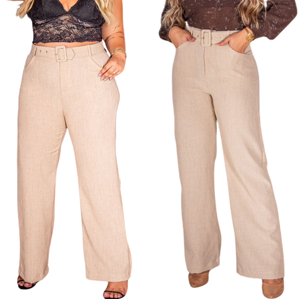 Calça Plus Size Feminina Pantalona Cintura Alta Com Bolso Cinto Encapado Linho Social G1