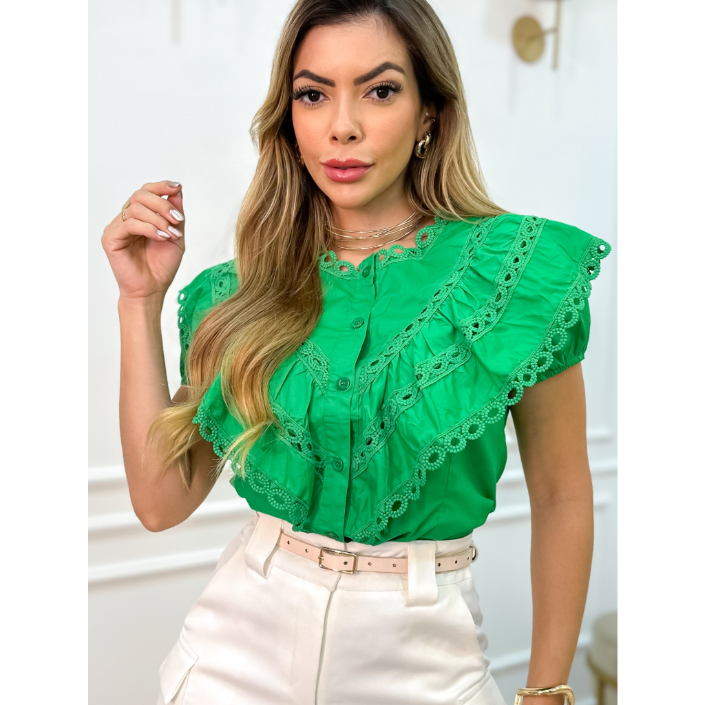 CAMISA FEMININO COM BOTÃO MANGA CURTA RENDA BORDADO B0995 MADE IN CHINA