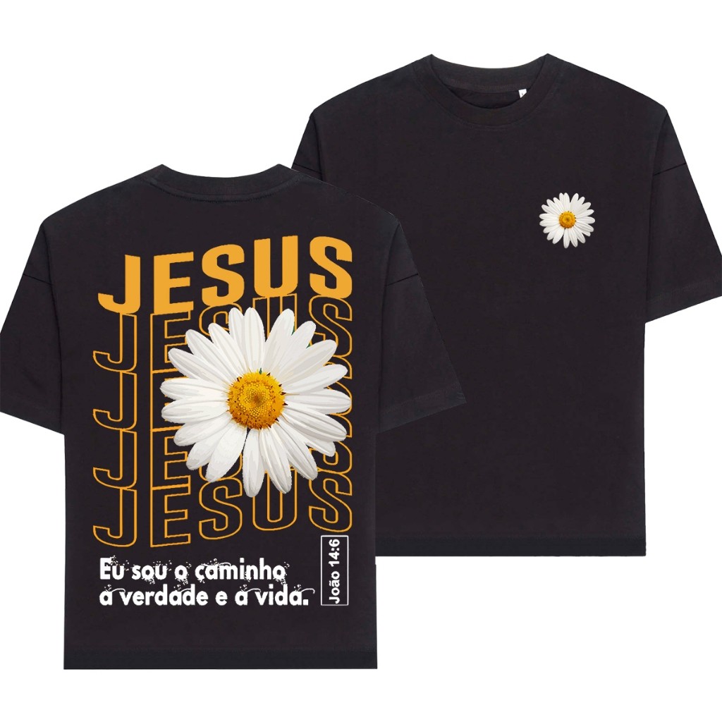 Camiseta Feminina Oversized ou T-shirt Estampa Cristã Gospel Fé Jesus Cristo Cruz Flor Girasol Preta
