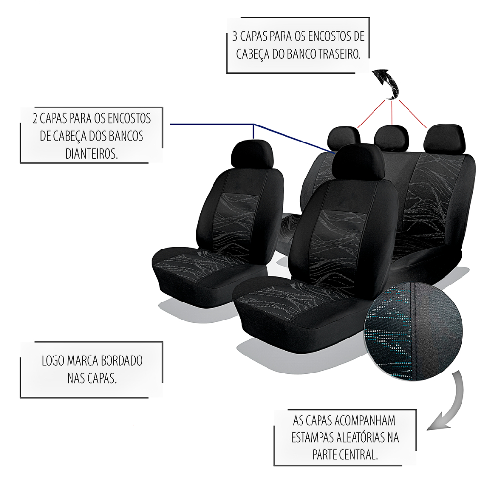 Fabricadas com material resistente e de alta qualidade, protegem os bancos originais contra sujeira, desgaste, líquidos e raios solares, prolongando a vida útil do estofado. Além disso, oferecem mais conforto durante o uso e valorizam o interior do veículo com um design moderno e elegante.