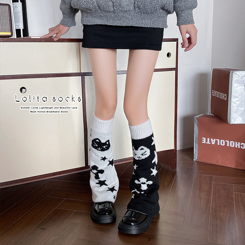 Japonês Bonito Malha Polainas Casual Doce Y2k Gato Estrela Impressão Dois Lados Usar Meias Femininas Vintage Harajuku Qu