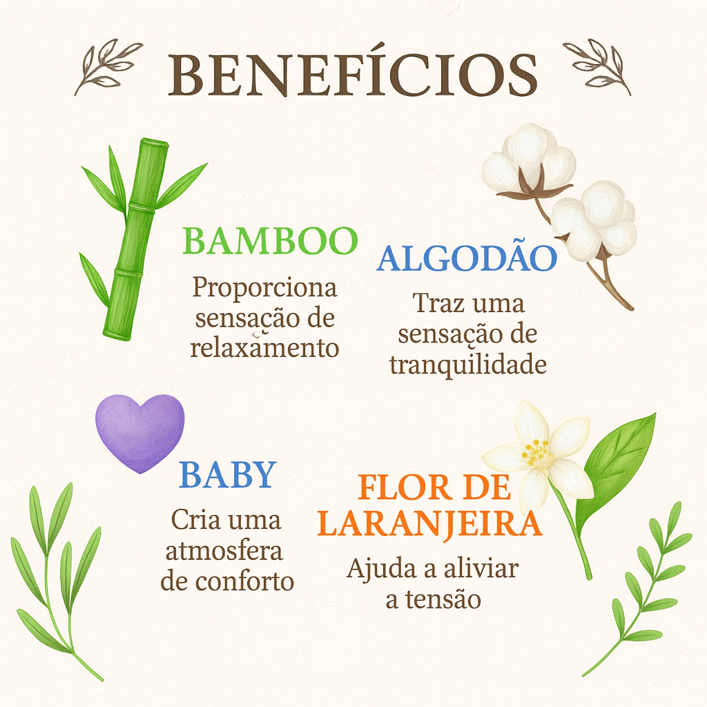 ☁️ Algodão: Fragrância macia e confortável, traz aconchego, pureza e tranquilidade para o ambiente.