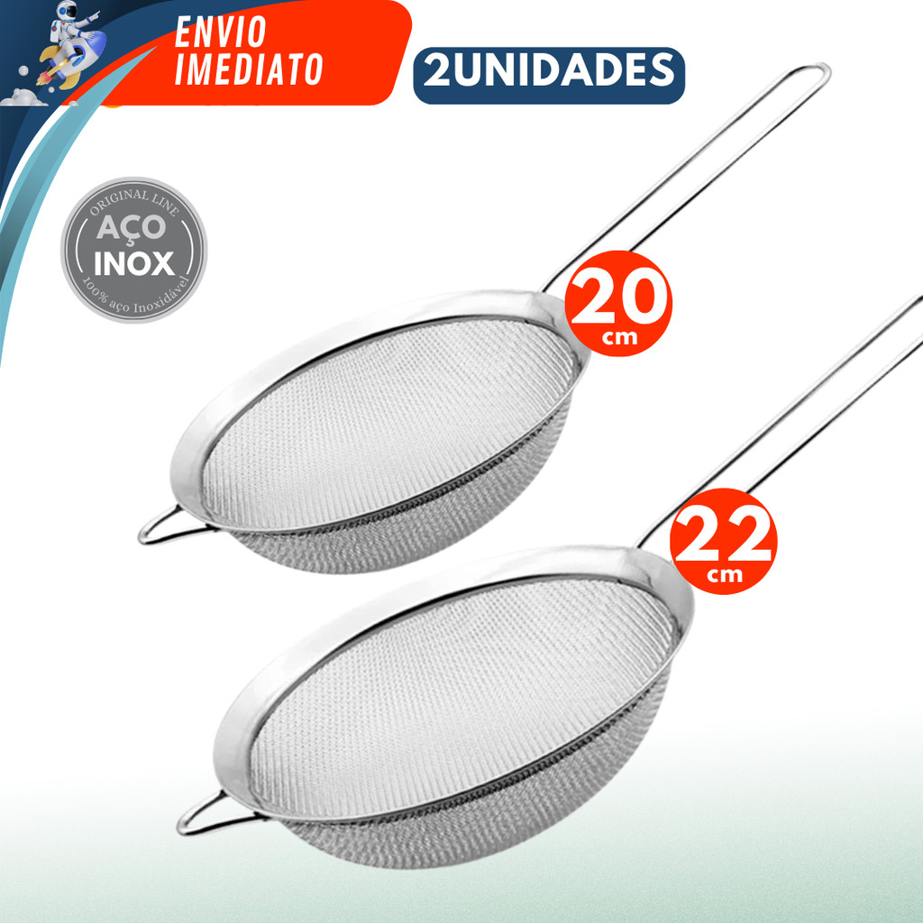Kit 2 Peneiras 22 e 20cm 10cm 100% Aço Inox Utensílios de Cozinha Conjunto Premium Coar Suco Confeitaria Coador Fritura