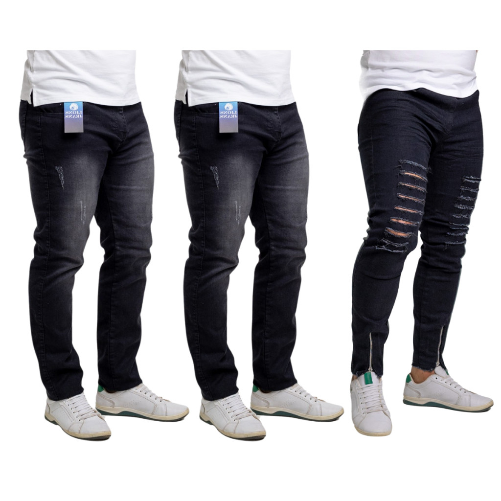 Kit 3 Calça Jeans Masculina Preta Rasgada Zíper+Preta Puído( Escolha A Terceira Peça) Premium Outlet