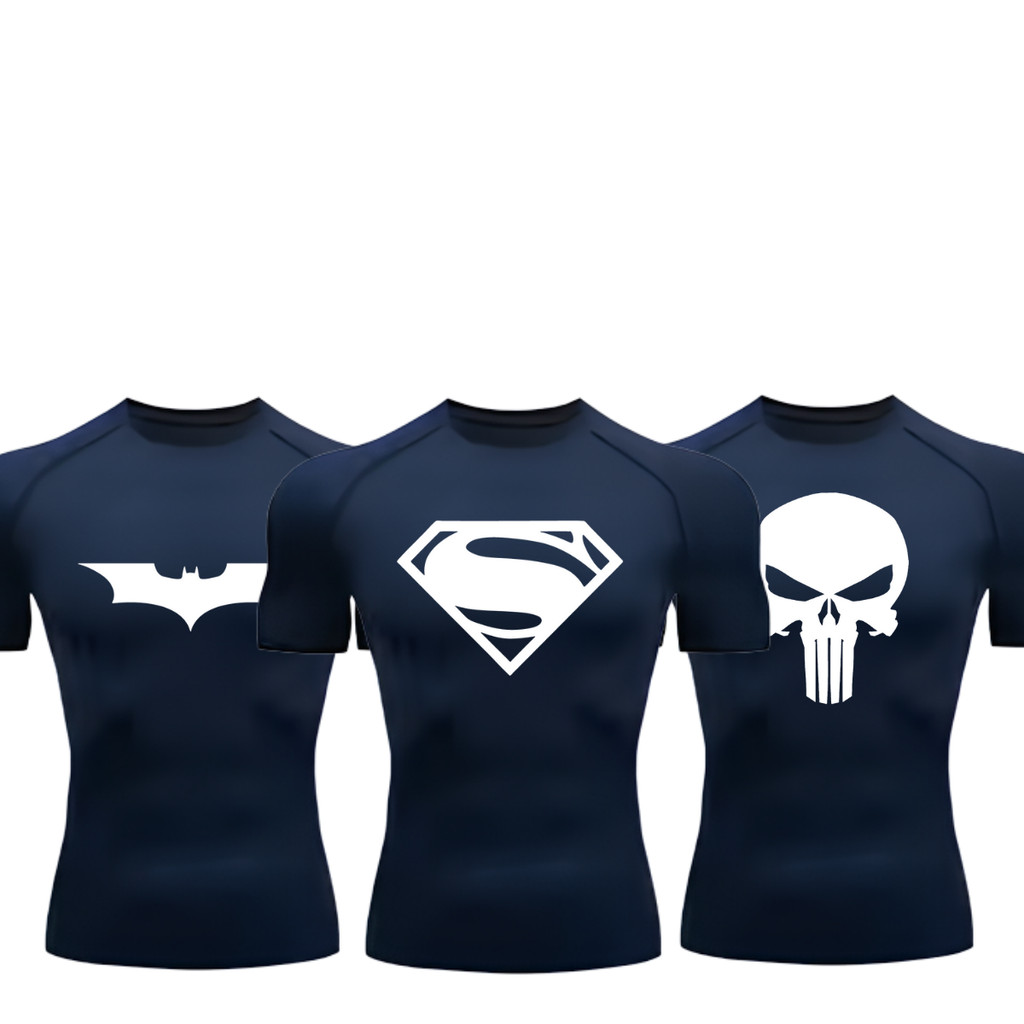 Kit 3 Camisetas Compressão Proteção Uv Estampada Tecido Gelado Segunda Pele Manga Curta Batman Super Homem Justiceiro