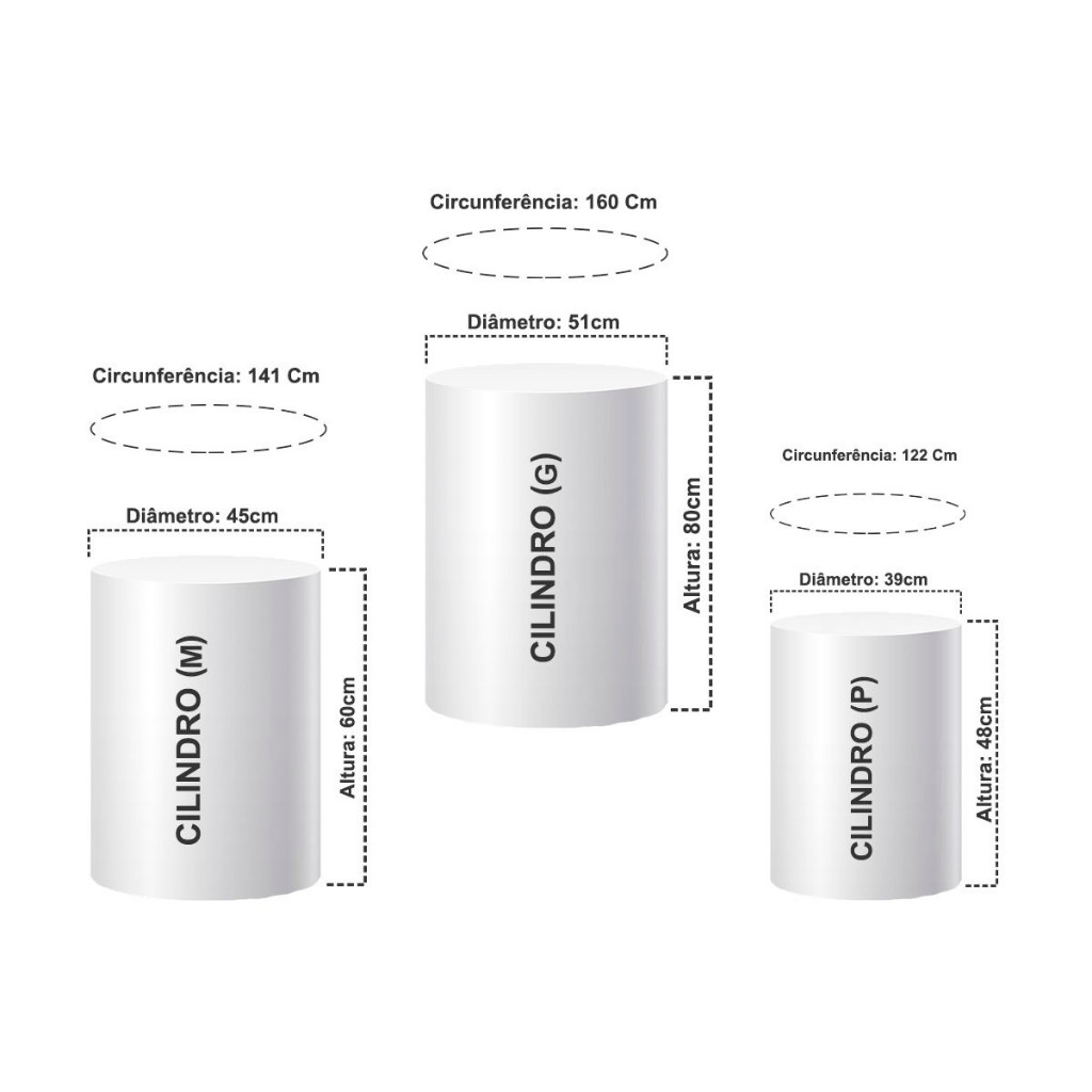 • Cilindro grande: Altura: 80 cm X Diâmetro: 50 cm X Circunferência: 157 cm