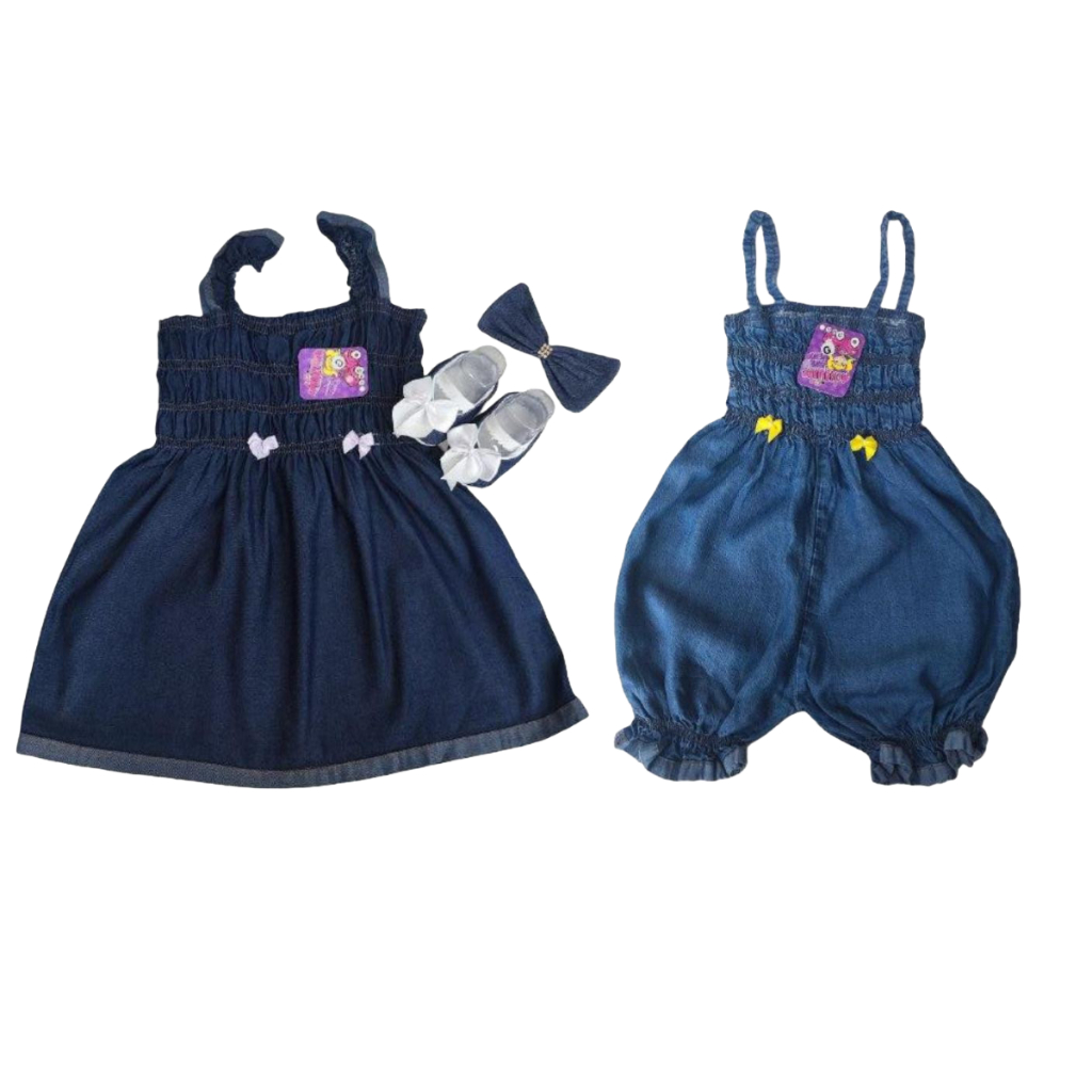 Kit Com 2 Roupinhas Vestido E Macacão Jeans Para Bebê Menina