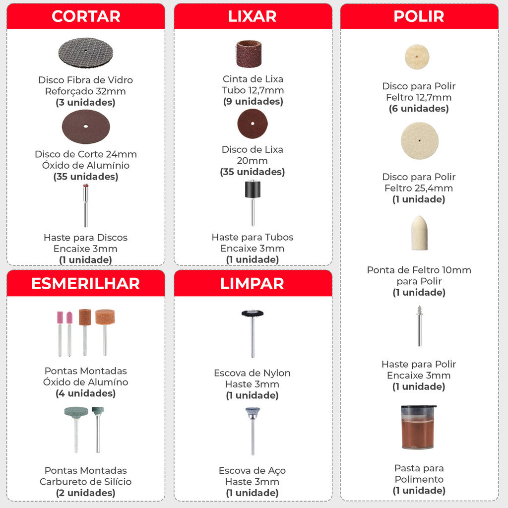 – Kit completo com 105 peças para lixar, polir, esmerilhar, limpar, gravar, desbastar e furar