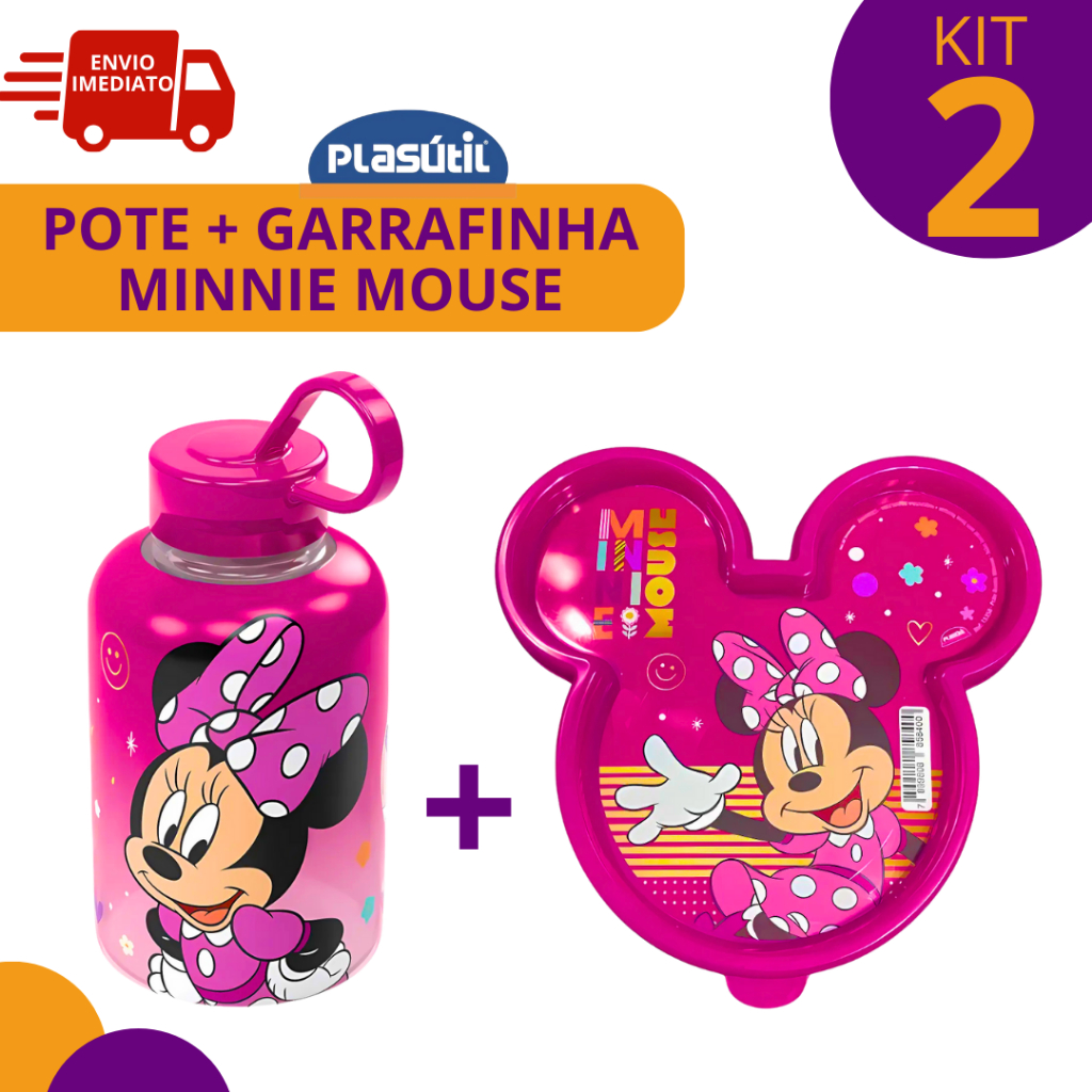 Kit Pote Marmita Rosto Minnie Rosa e Garrafa Com Alça 120ML Plasútil – A Lancheira Perfeita para o Volta às Aulas!