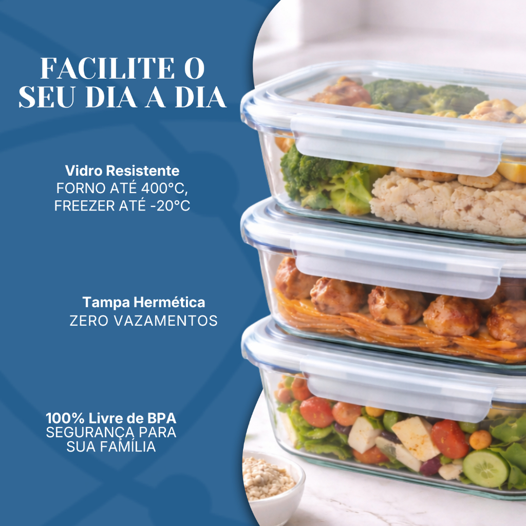 Transforme a forma como você organiza, armazena e transporta suas refeições com o Kit de Marmitas de Vidro Herméticas 630ml, desenvolvido para quem busca praticidade, durabilidade e segurança no dia a dia.