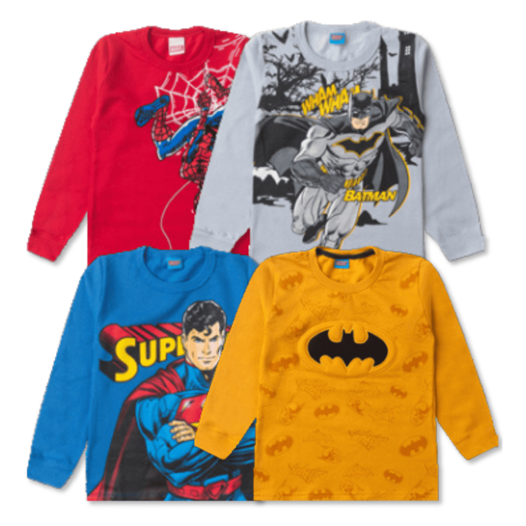 ▪️ Esse kit inclui 4 Camisas de Manga Longa de Personagem, confeccionados em 100% ALGODÃO fio 30/1, proporcionando durabilidade, maciez e facilidade de cuidado. As golas possuem ajuste de RIBANA, garantindo um ajuste perfeito ao corpo do seu menino ⚽