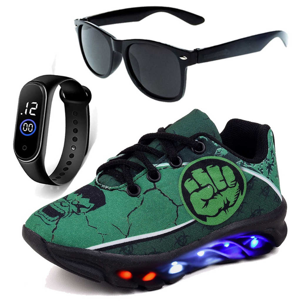Kit Tenis Masculino Infantil De Led Meninos Hulk 013 + Óculos e Relógio