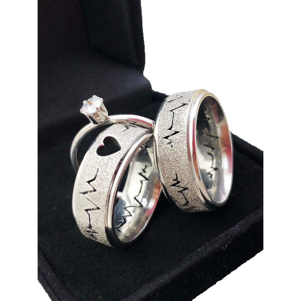 Par Aliança Prata coração e batimentos cardíacos com anel solitário aparador 8mm com caixinha de veludo
