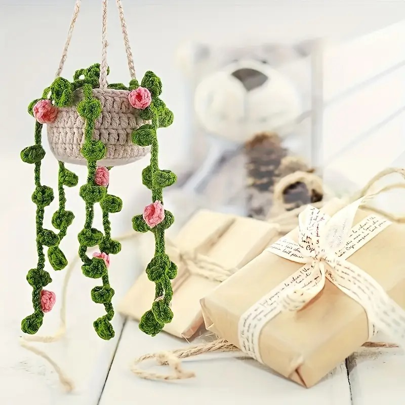Transforme o interior do seu carro com esse vasinho de crochê com flores pendentes, unindo beleza e bem-estar em cada trajeto!