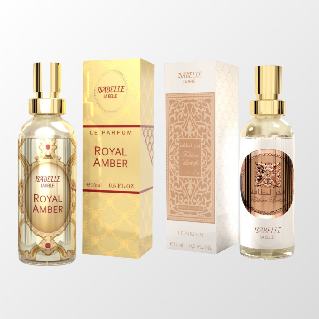 Perfume Royal Amber 15ml + Fakhar Rose 15ml – Isabelle la Belle EDP – Perfumes para Bolso