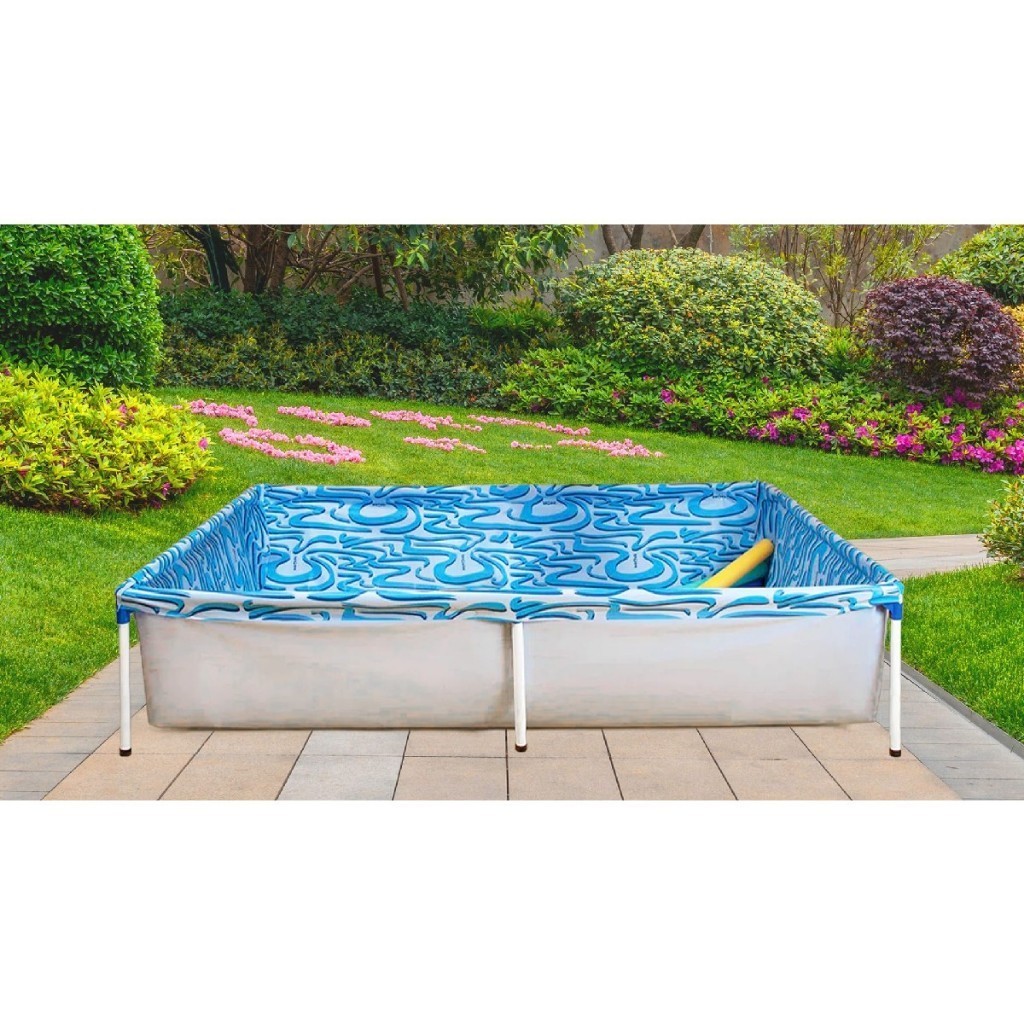 A piscina possui capacidade para até 1000 litros de água, formato retangular e é prática de montar, desmontar e transportar para qualquer lugar. Sua estrutura fabricada em aço com acabamento em pintura epóxi proporciona resistência e estabilidade, enquanto a lona robusta garante durabilidade e segurança durante o uso.