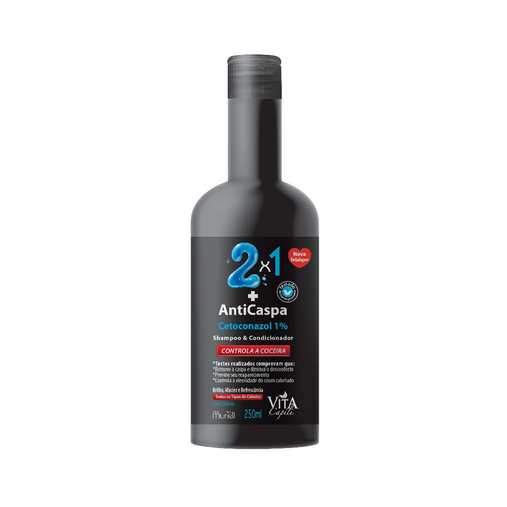 Sua formulação contém ativos como o própolis e alantoína que protegem a pele, remove a caspa, diminui o desconforto, previne seu reaparecimento e controla a oleosidade do couro cabeludo, proporcionando brilho, maciez, refrescância e condicionamento dos fios.Shampoo e Condicionador 2×1 Vita Capili Men Anticaspa 2 Em 1 Limpeza Profunda 250ml – Muriel