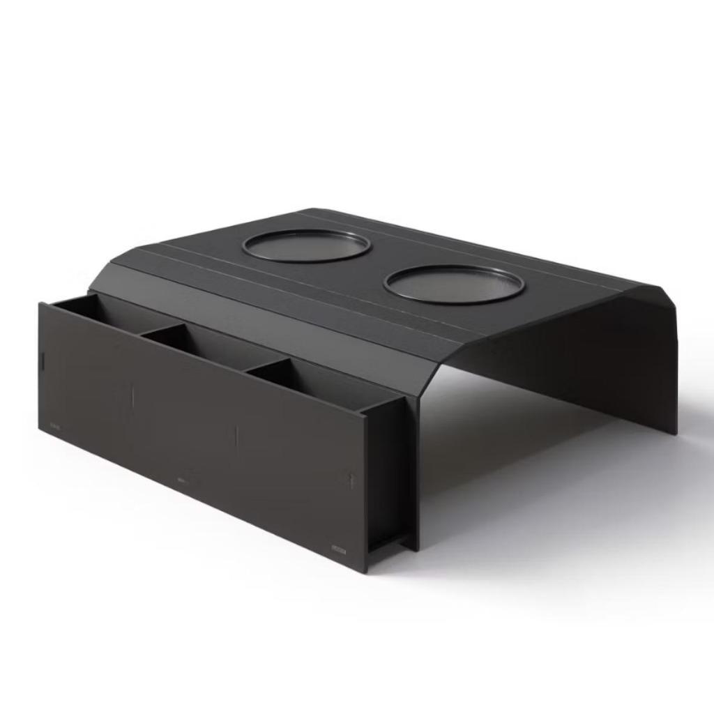 Porta-copos duplo embutido, garantindo estabilidade para bebidas.